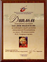 Нас нашла награда. В преддверии 50-ой годовщины полета Ю.А. Гагарина в космос мы получили Диплом. Диплом дан за наше участие в разработке пульта управления пилотируемого корабля "СОЮЗ ТМА.Эти пульты, в составе кораблей Союз ТМА летают уже почти 9 лет - с 2002 года. |