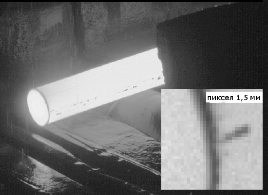 Пример изображения торца проката диаметром 150 мм на прокатном стане Нижне-Тагильского металлургического комбината. Изображения были полученны с целью оценки возможности автоматизации точной резки проката.
