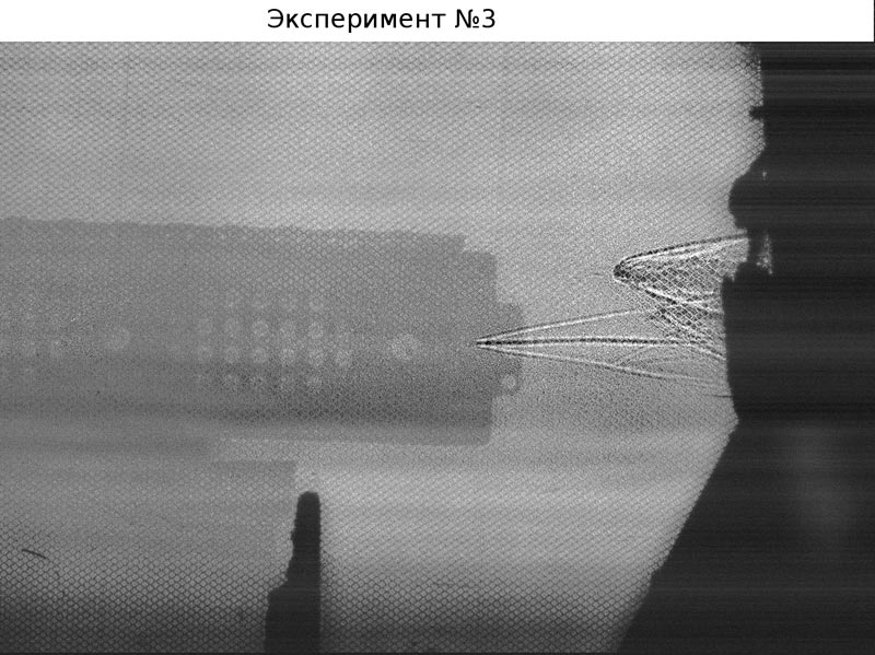 На рисунке эксперимента №3 приведено изображение полета шарика на скорости около 2,5 км/с.