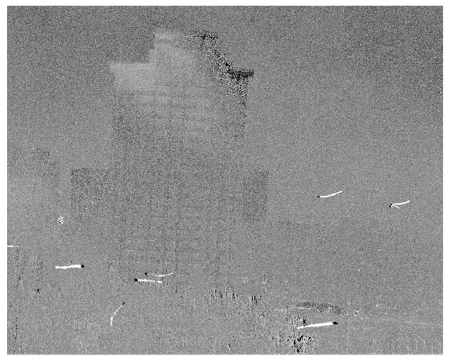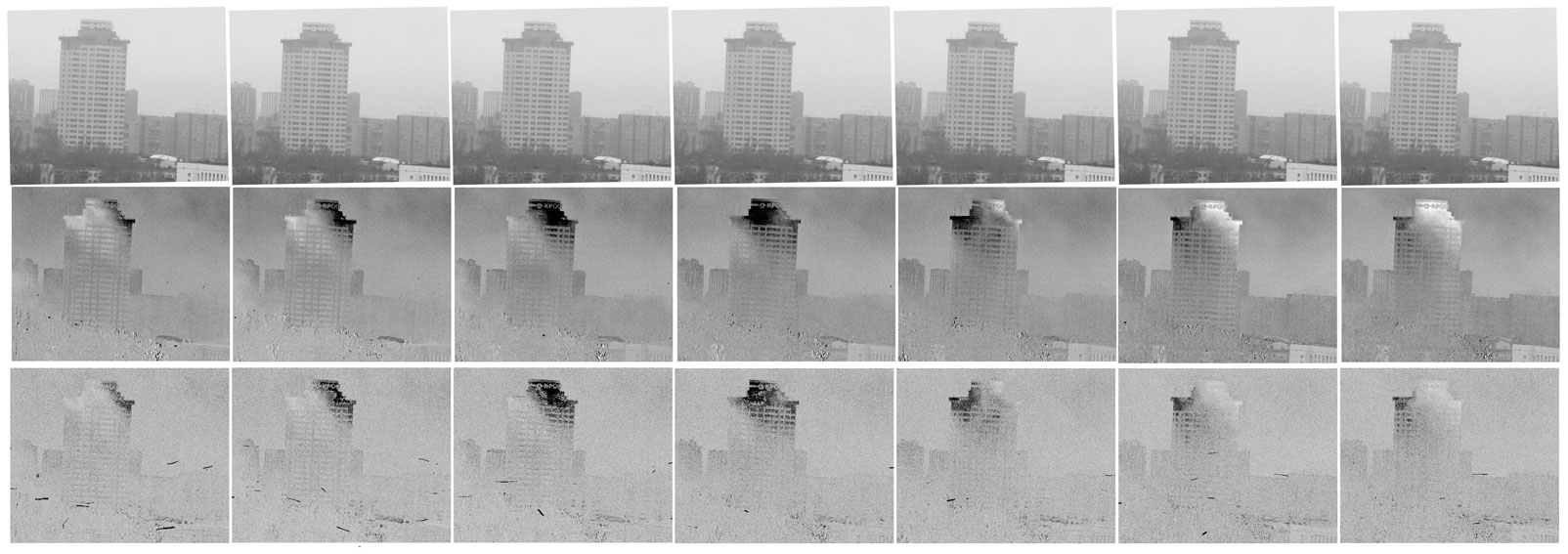 На кадрах, снятых обычной видеокамерой (верхняя строка) каких-либо изменений освещенности башни не выявляется, в то время как на кадрах второй стоки, полученные камерой ВидеоМКР, видны совпадающие с движением облаков тени. Сравнение этих изображений наглядно показывает возможности камеры ВидеоМКР выявлять протяженные объекты сверхмалой контрастности.