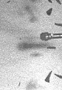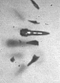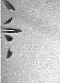 Серия из трех кадров зарегистрированных комплексом NANOGATE FRAME-4Cерия из трех кадров процесса распада объекта при его движении по траектории со скоростью примерно 1000 м/с. Интервалы между кадрами 200 мкс (между первым и вторым) и 120 мкс (между вторым и третьим кадром). Времена экспозиции для каждого кадра указаны под фотографией.