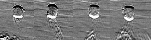 Пулька из духового пистолета летит правильно (2 левых снимка) и задом наперед (2 правых). |